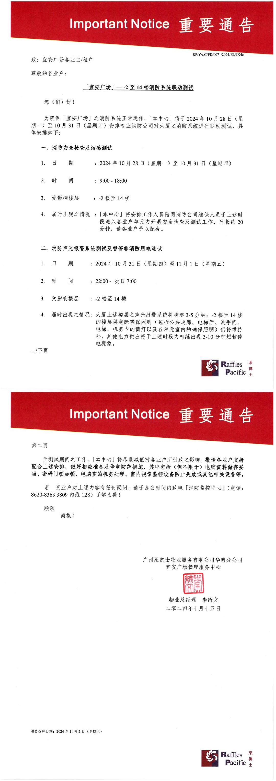 「宜安广场」——-2至14楼消防系统联动测试